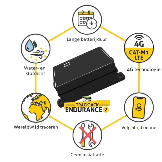 The TrackJack Endurance is a user-friendly, mobile track-and-trace system with a long battery life that can be mounted in a car, boat, camper van, container, piece of equipment or other objects. Thanks to its powerful battery, there is no need to connect the TrackJack Endurance to a power supply.