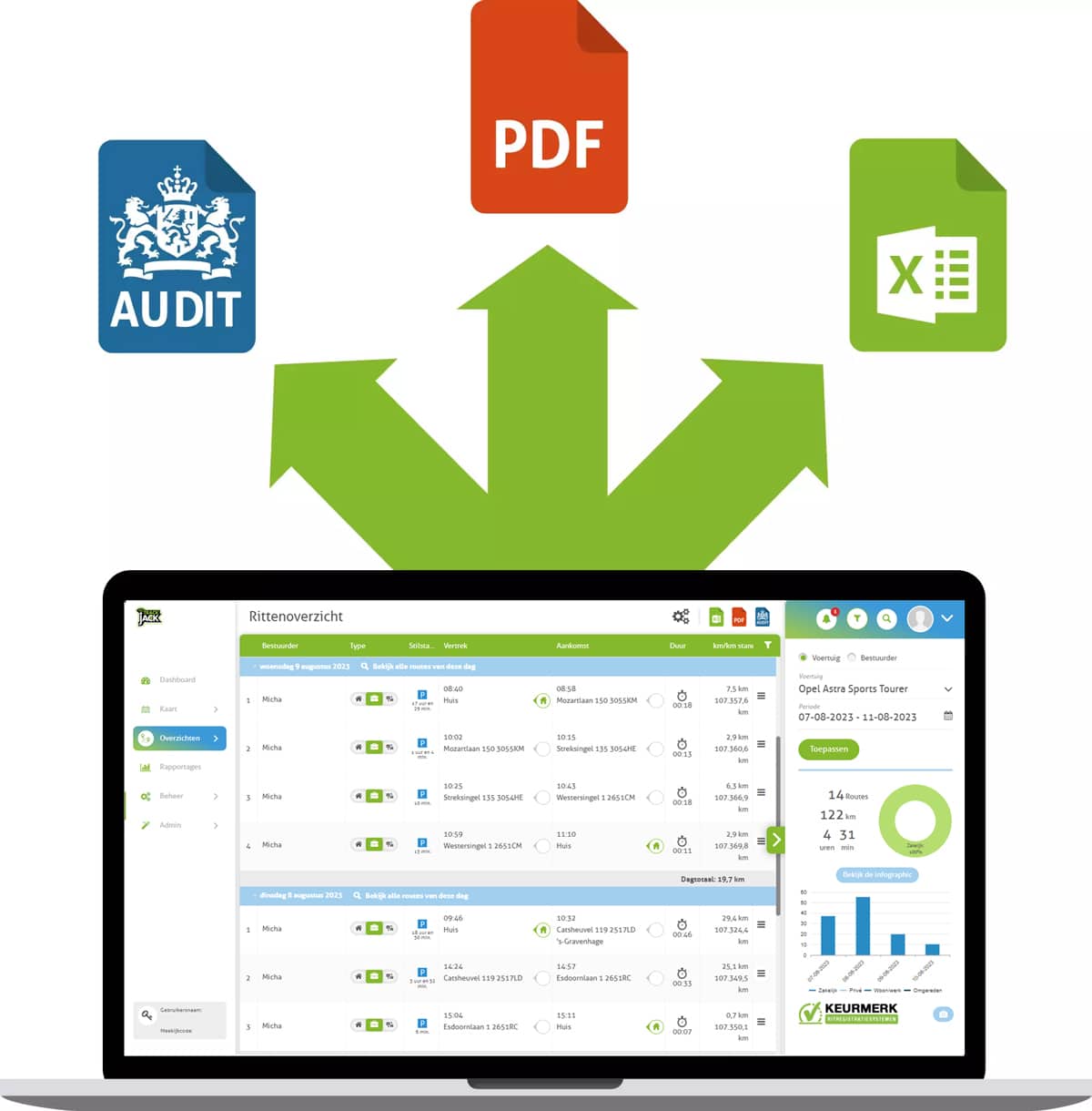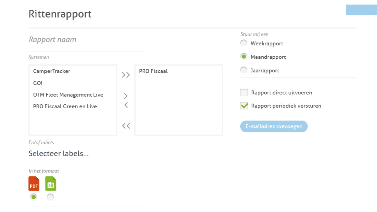 With just a few clicks, you can download your full journey log to Excel, PDF or an Auditfile for the tax authorities.